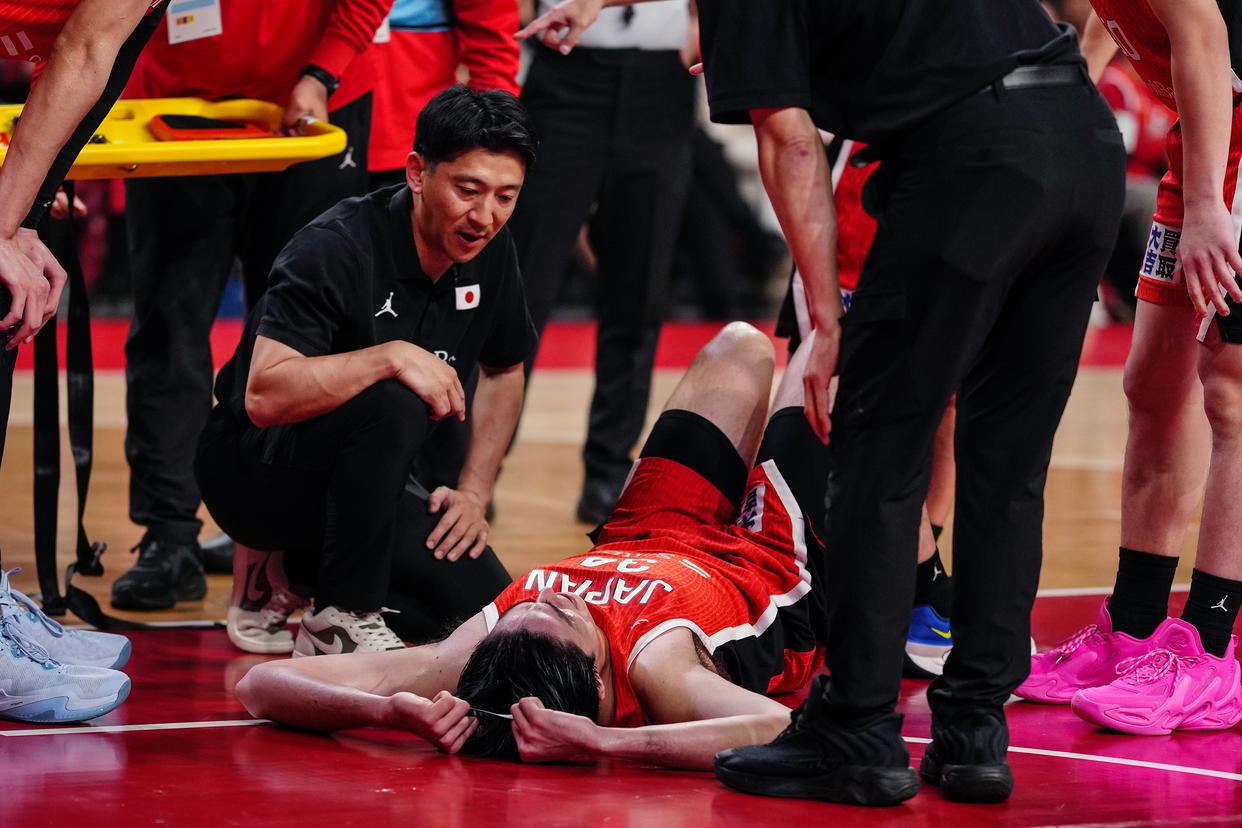 2月26日,日本队球员渡边飞勇(下)在比赛中受伤倒地。新华社记者 贾浩成 摄