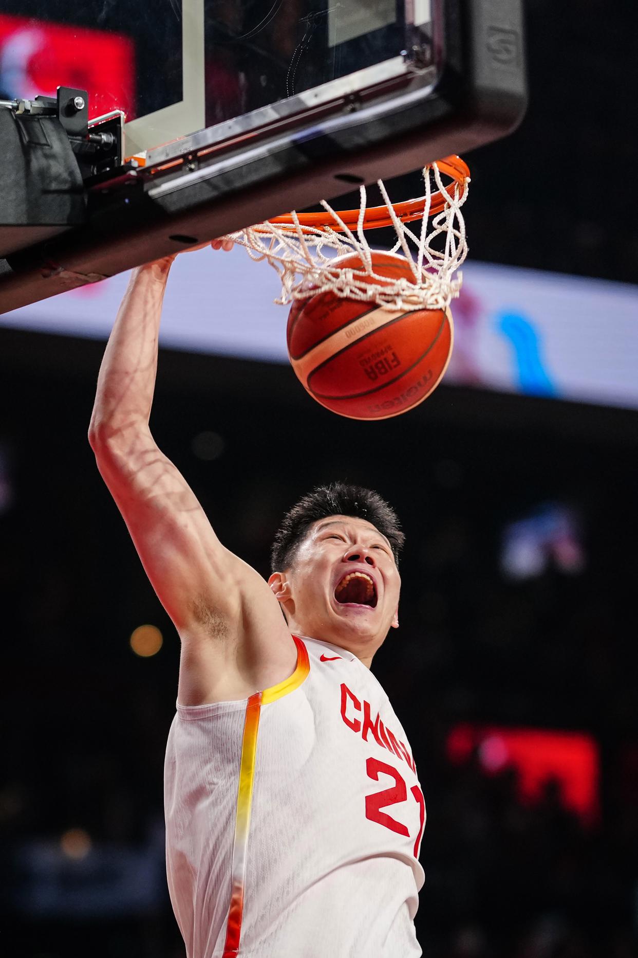 2月26日,中国队球员胡金秋在比赛中扣篮。新华社记者 贾浩成 摄