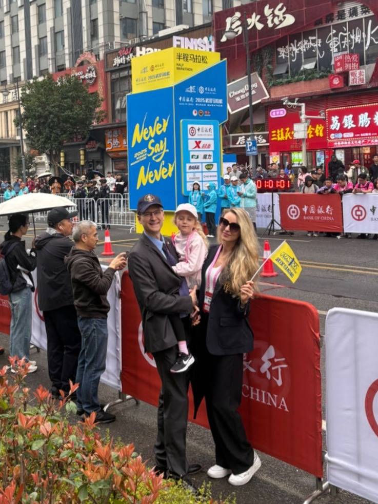 2025年3月23日,武汉马拉松半马终点处,美国驻武汉总领事柯儒思与夫人、女儿一同为参赛选手加油助威。(来源长江日报)