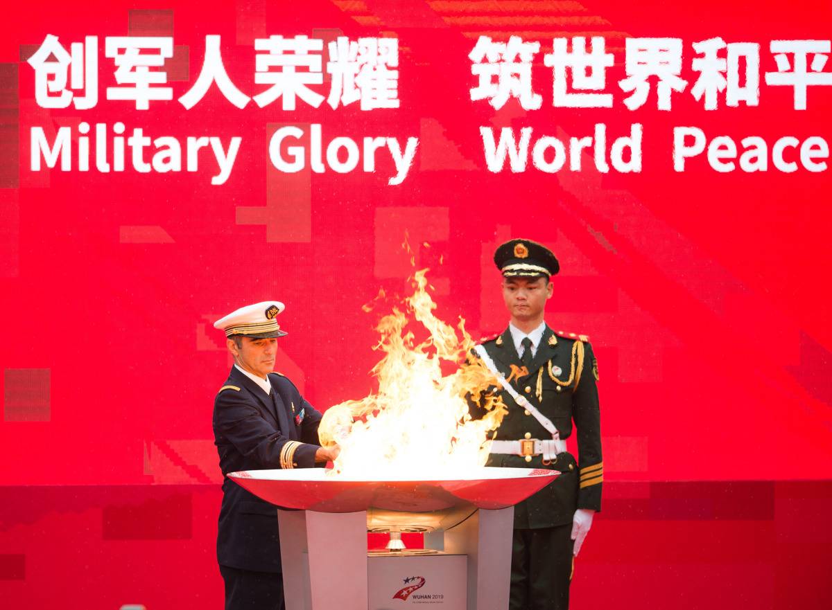 国际军事体育理事会主席赫尔维·皮奇里洛(左)点燃第七届世界军人运动会圣火。