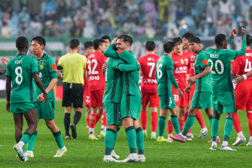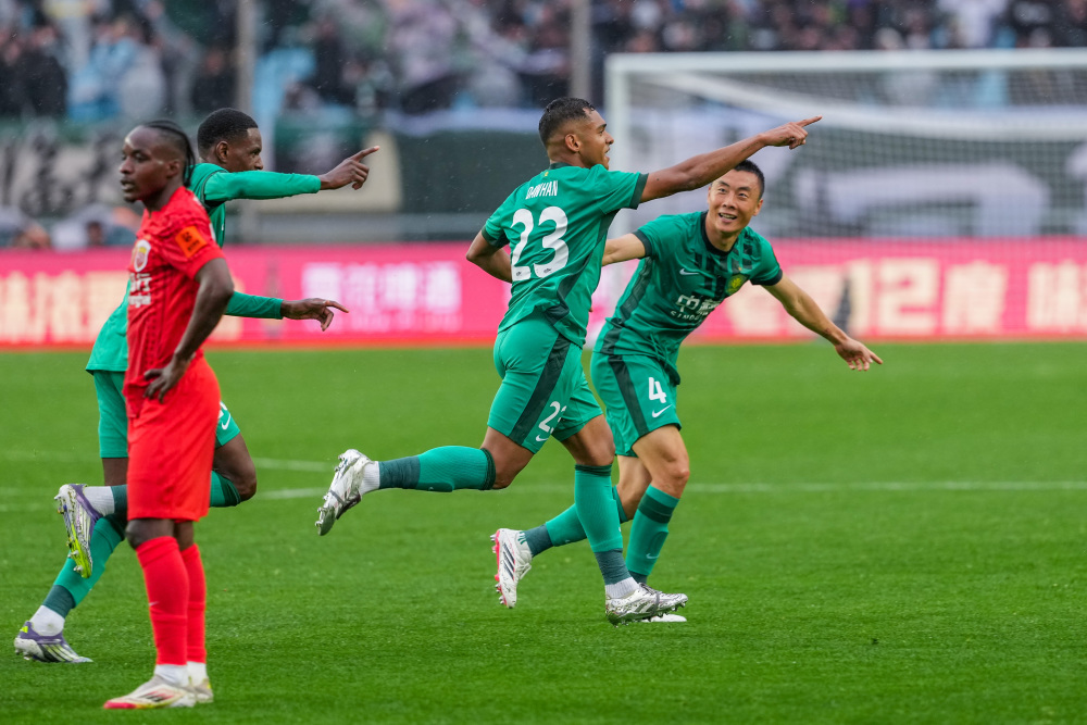 3月1日,北京国安队球员达万(右二)在比赛中庆祝进球。新华社记者 李博 摄