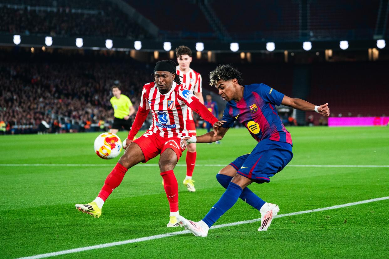 3月3日,巴塞罗那队球员亚马尔(右)与马德里竞技队球员卢克曼在比赛中拼抢。新华社发(胡安·戈萨摄)