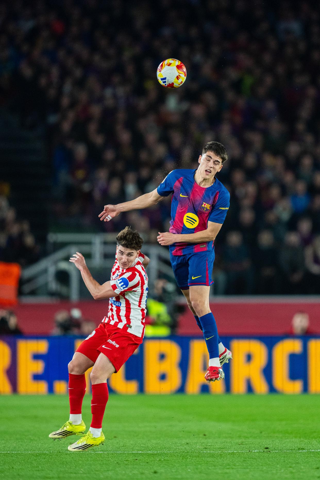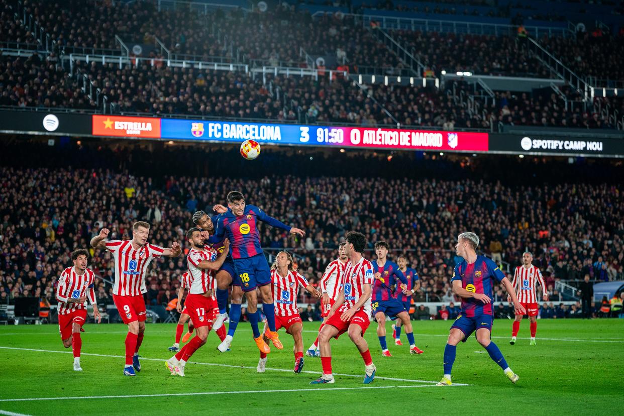 3月3日,巴塞罗那队球员费兰·托雷斯(左)在比赛中头球攻门。新华社发(胡安·戈萨摄)