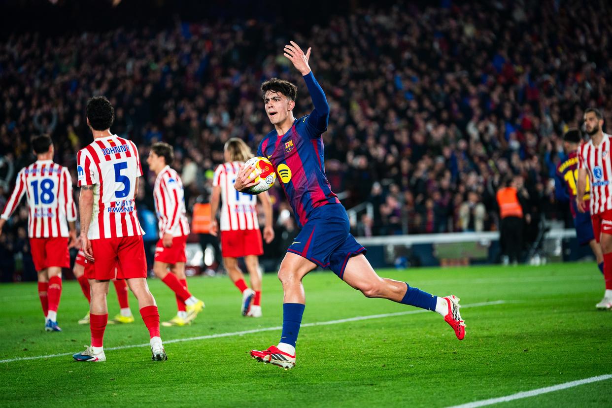 3月3日,巴塞罗那队球员亚马尔(左三)与马德里竞技队球员鲁杰里(左一)在比赛中拼抢。新华社发(胡安·戈萨摄)