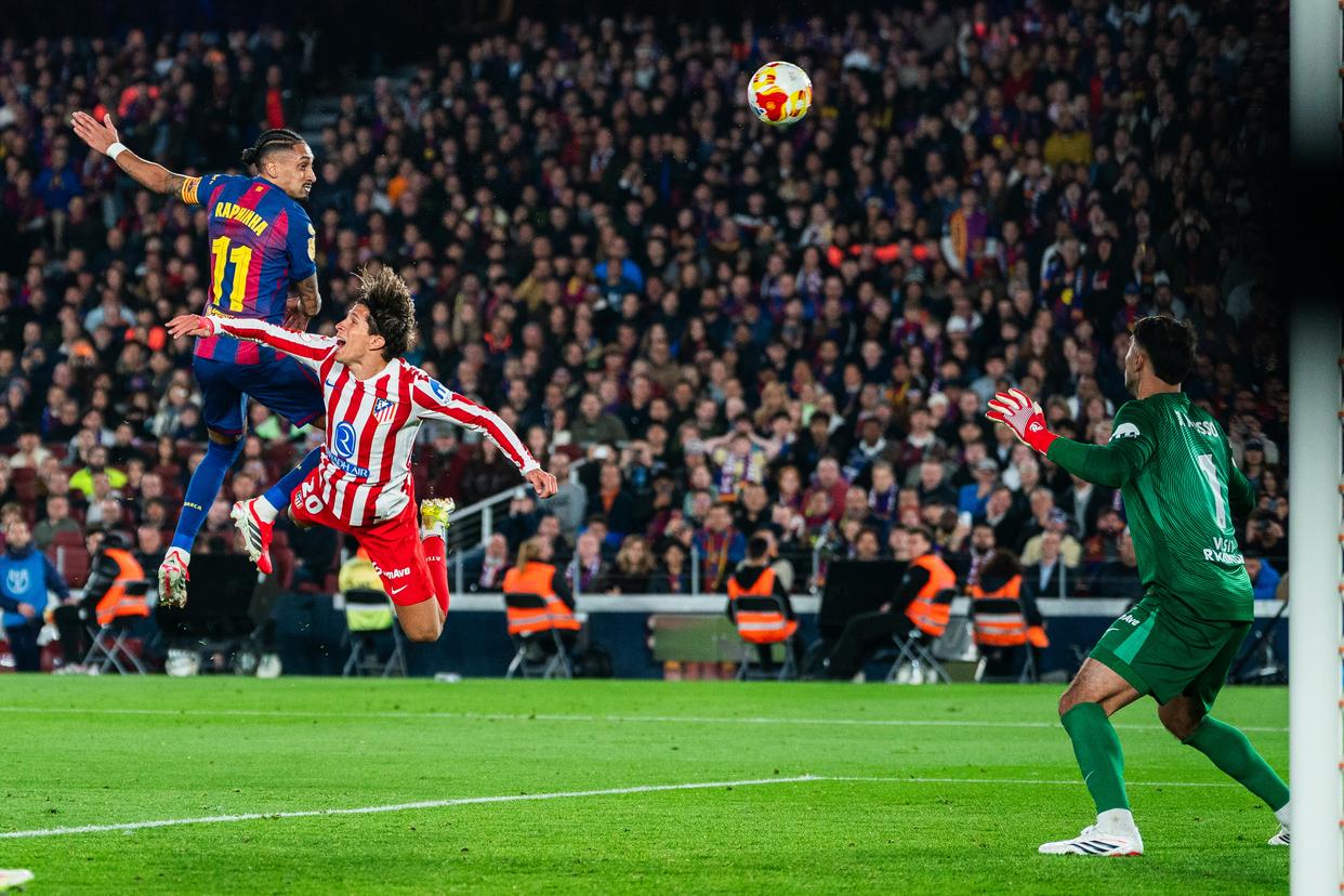 3月3日,巴塞罗那队球员拉菲尼亚(上左)在比赛中头球攻门。新华社发(胡安·戈萨摄)