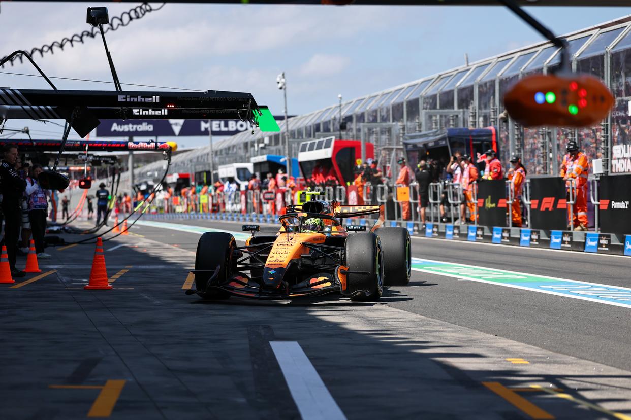 3月6日,迈凯伦车队英国车手诺里斯驶入车房。新华社发(钱俊摄)