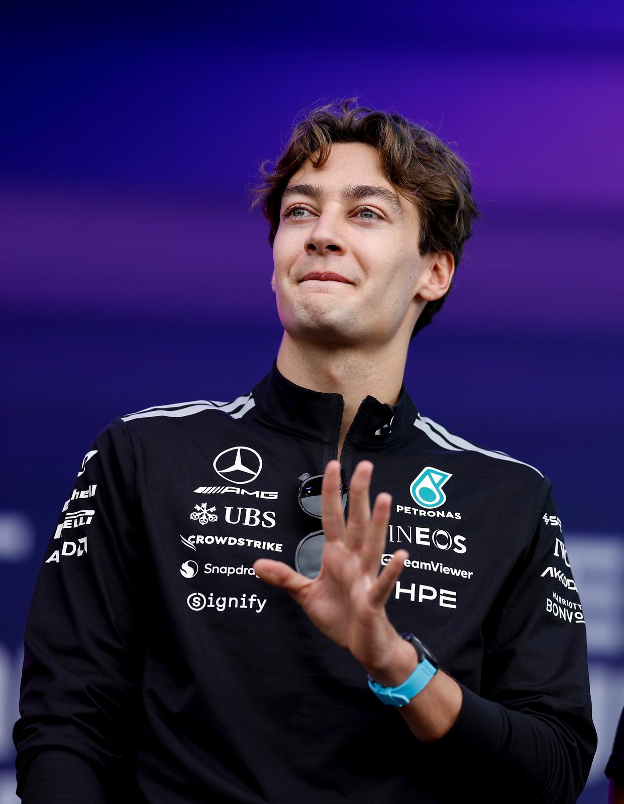 3月6日,梅赛德斯车队英国车手拉塞尔出席练习赛前的车迷见面会。新华社记者 马平 摄