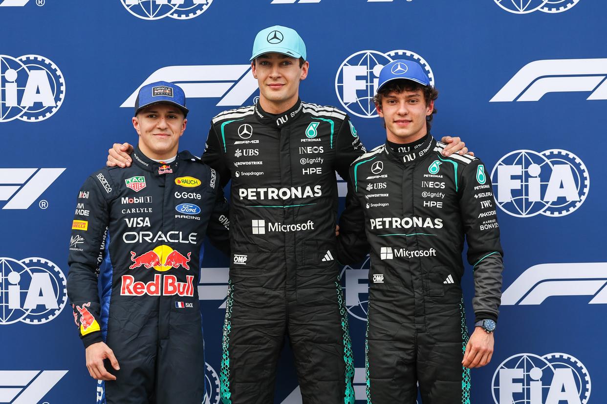 3月7日,获得排位赛前三名的梅赛德斯车队英国车手拉塞尔(中)、其意大利队友安东内利(右)和红牛车队法国车手哈贾尔赛后合影。新华社发 (钱俊摄)