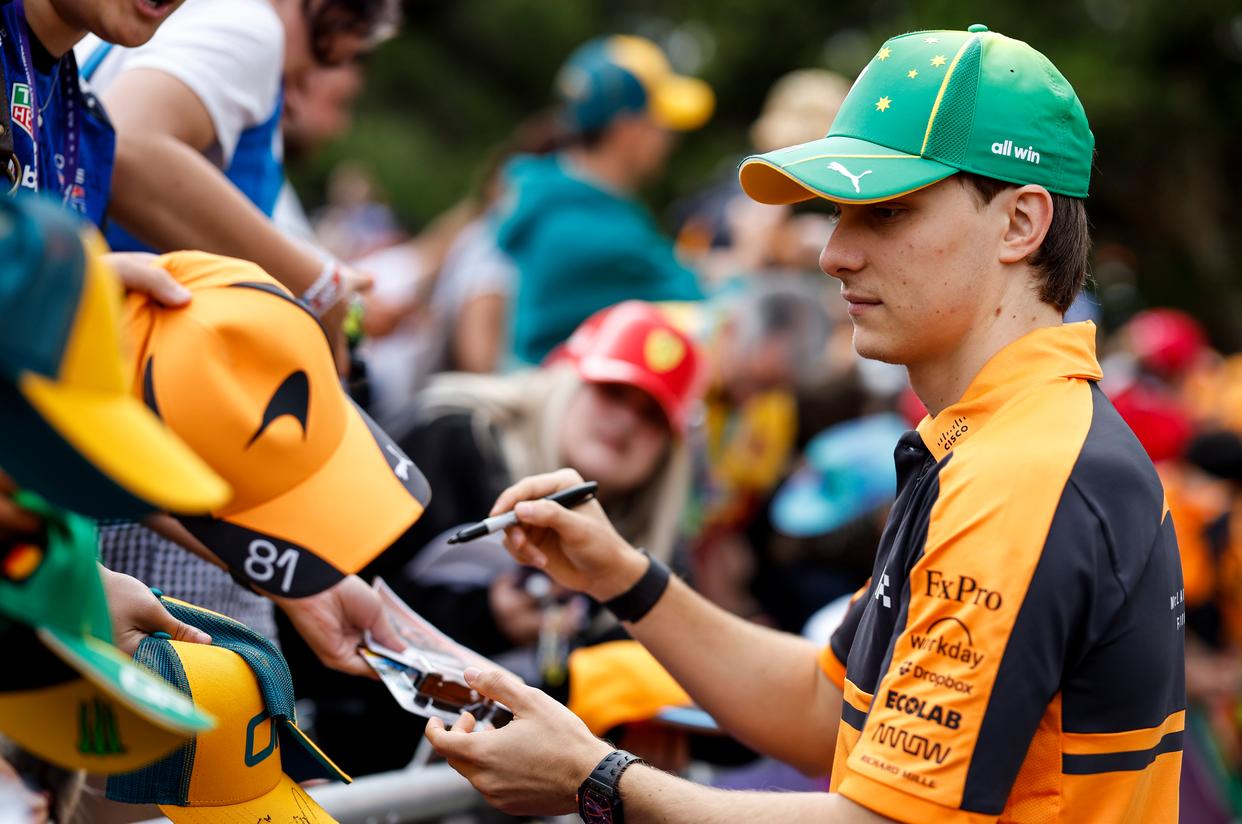 3月7日,迈凯伦车队澳大利亚车手皮亚斯特里在排位赛前与车迷互动。 新华社记者 马平 摄
