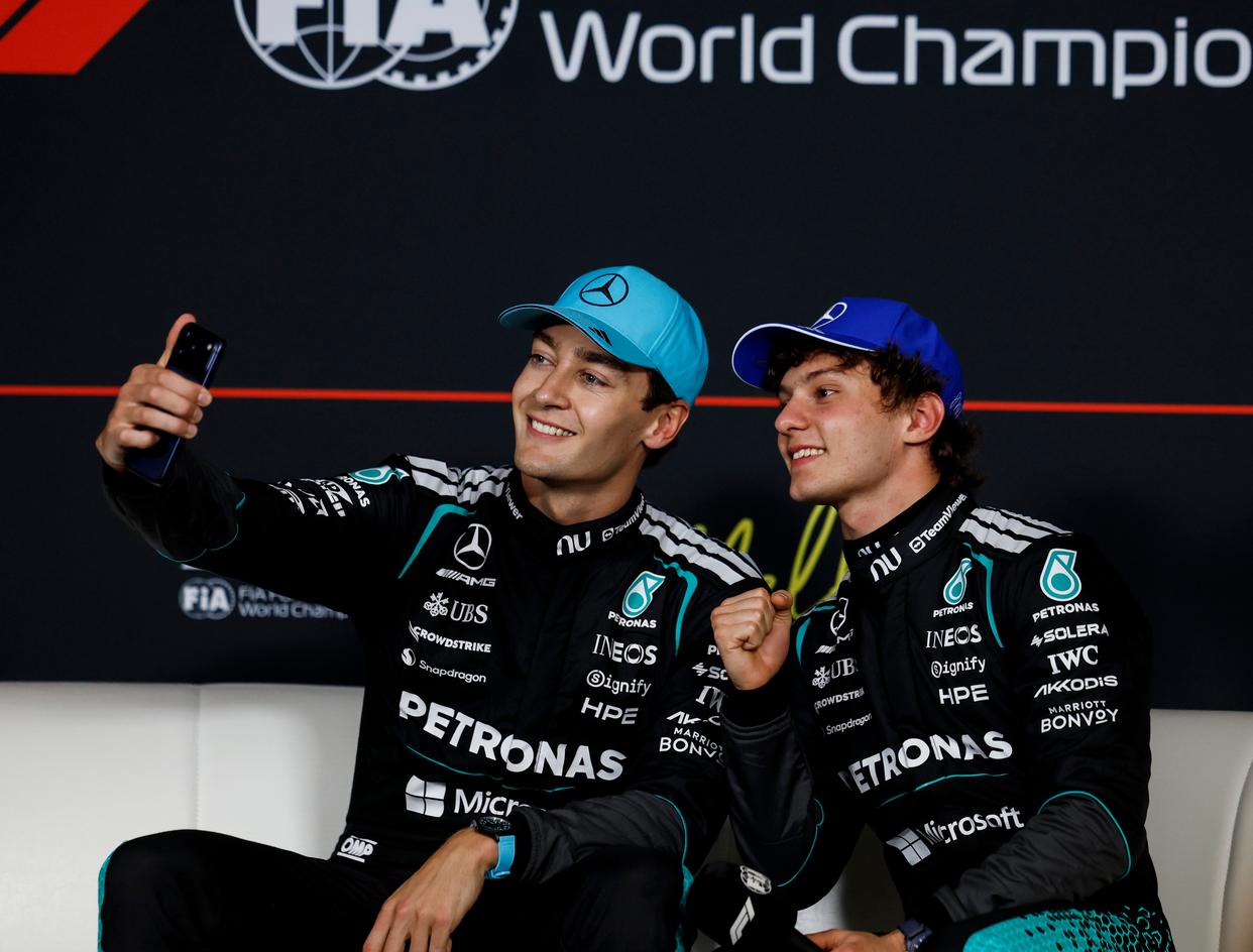 3月7日,梅赛德斯车队车手拉塞尔(左)和队友安东内利出席排位赛后的新闻发布会。新华社记者 马平 摄