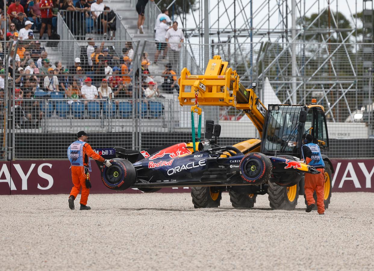 3月7日,红牛车队荷兰车手维斯塔潘的车被吊车挪走。新华社记者 马平 摄