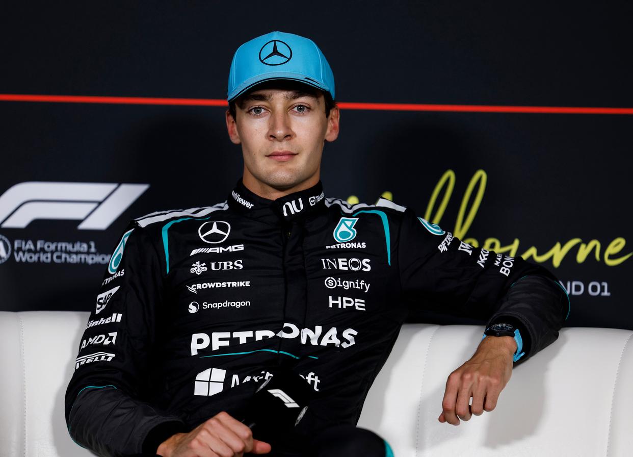 3月7日,梅赛德斯车队英国车手拉塞尔出席排位赛后的新闻发布会。新华社记者 马平 摄