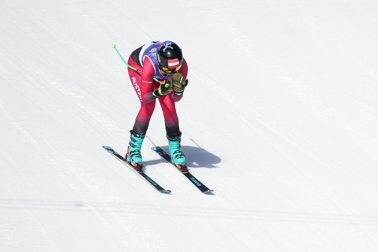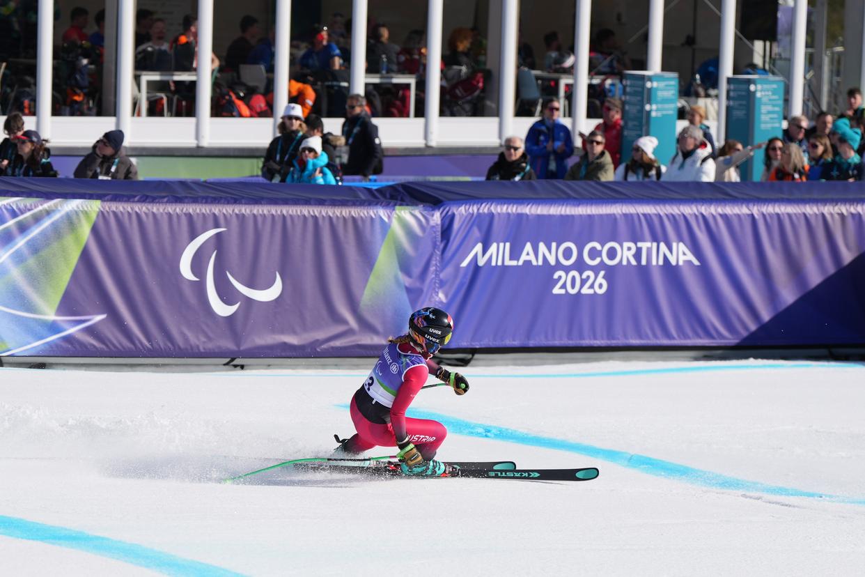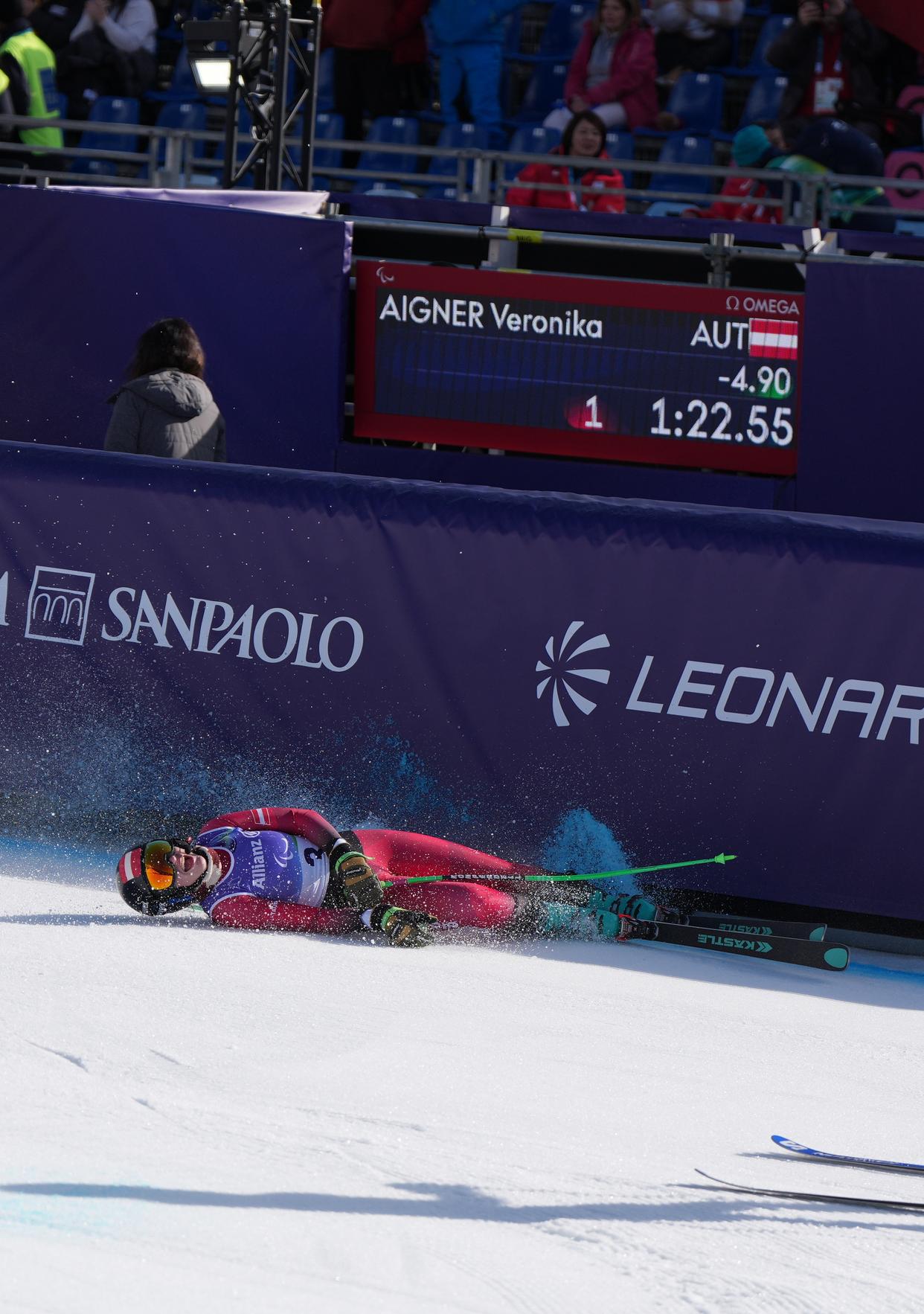 当地时间3月7日,在意大利科尔蒂纳举行的米兰-科尔蒂纳冬残奥会高山滑雪女子滑降(视障组)比赛中,奥地利选手韦罗妮卡·艾格纳夺得冠军。这是本届冬残奥会产生的首枚金牌。