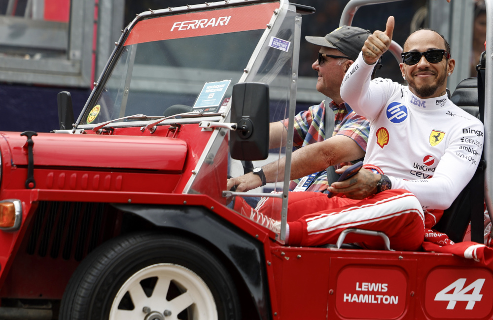 3月8日,法拉利车队英国车手汉密尔顿在巡游中。新华社记者 马平 摄