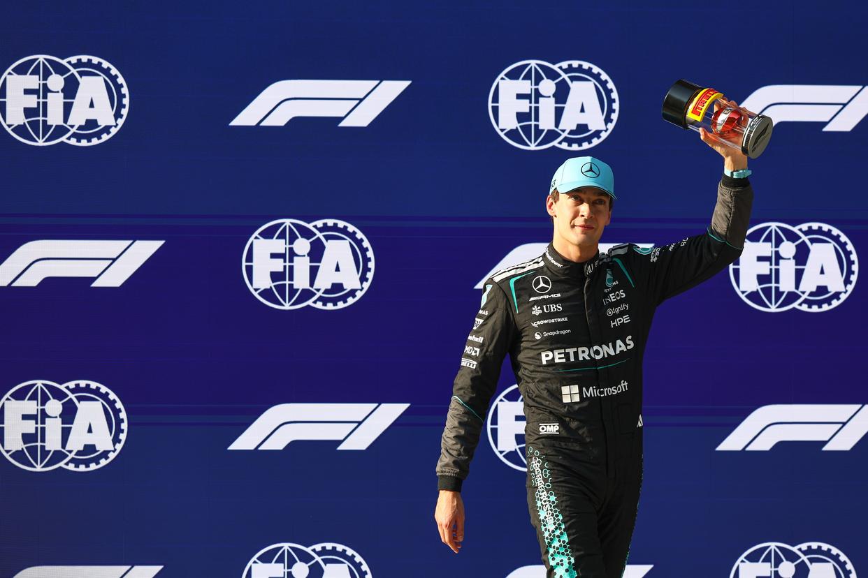 3月13日,梅赛德斯车队英国车手拉塞尔在比赛后庆祝。新华社发(钱俊 摄)