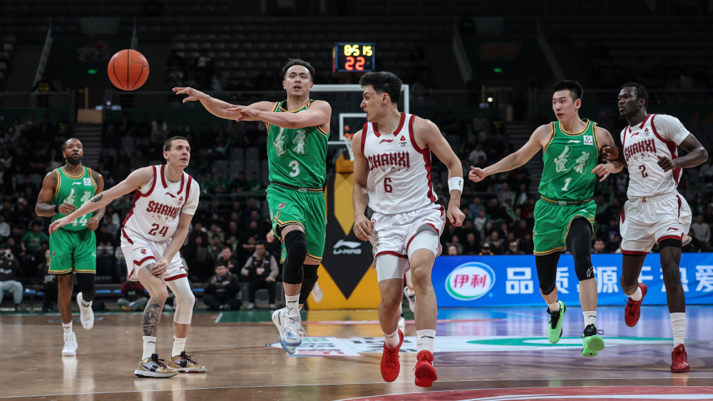 3月13日,辽宁本钢队球员赵继伟(左三)在比赛中传球。新华社记者 潘昱龙 摄