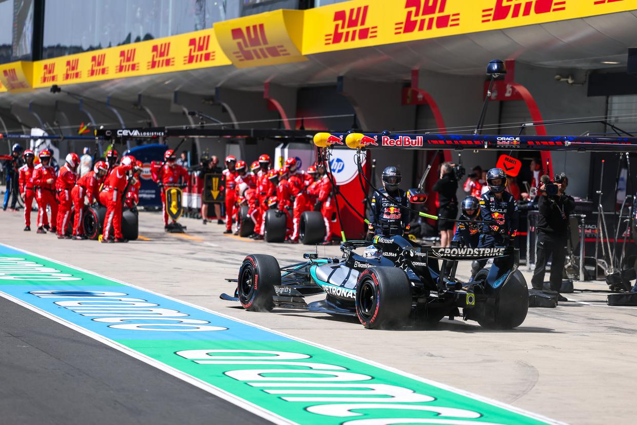 3月14日,梅赛德斯车队英国车手拉塞尔在比赛中进入维修区。他最终获得冠军。新华社发(钱俊摄)