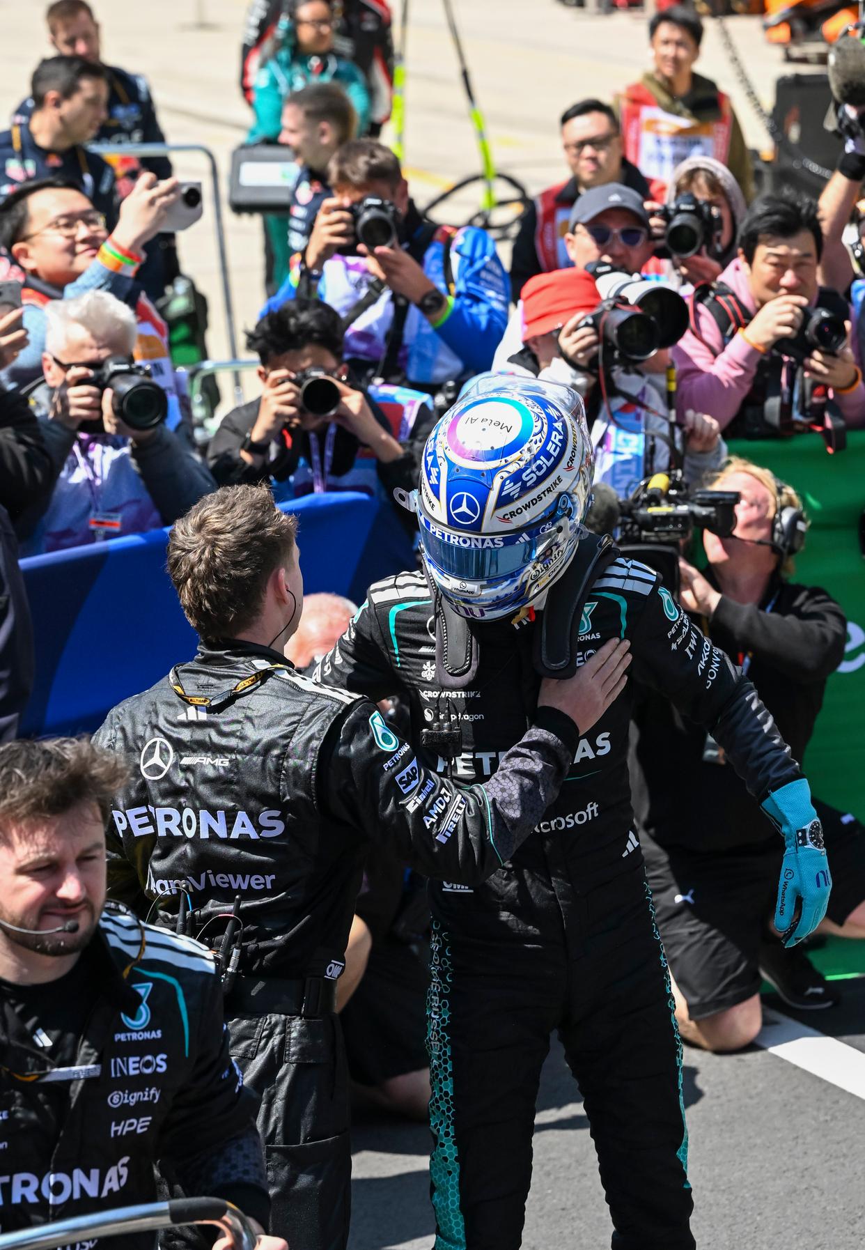 3月14日,梅赛德斯车队英国车手拉塞尔(右)在夺冠后与车队成员拥抱。新华社记者 陈浩明 摄