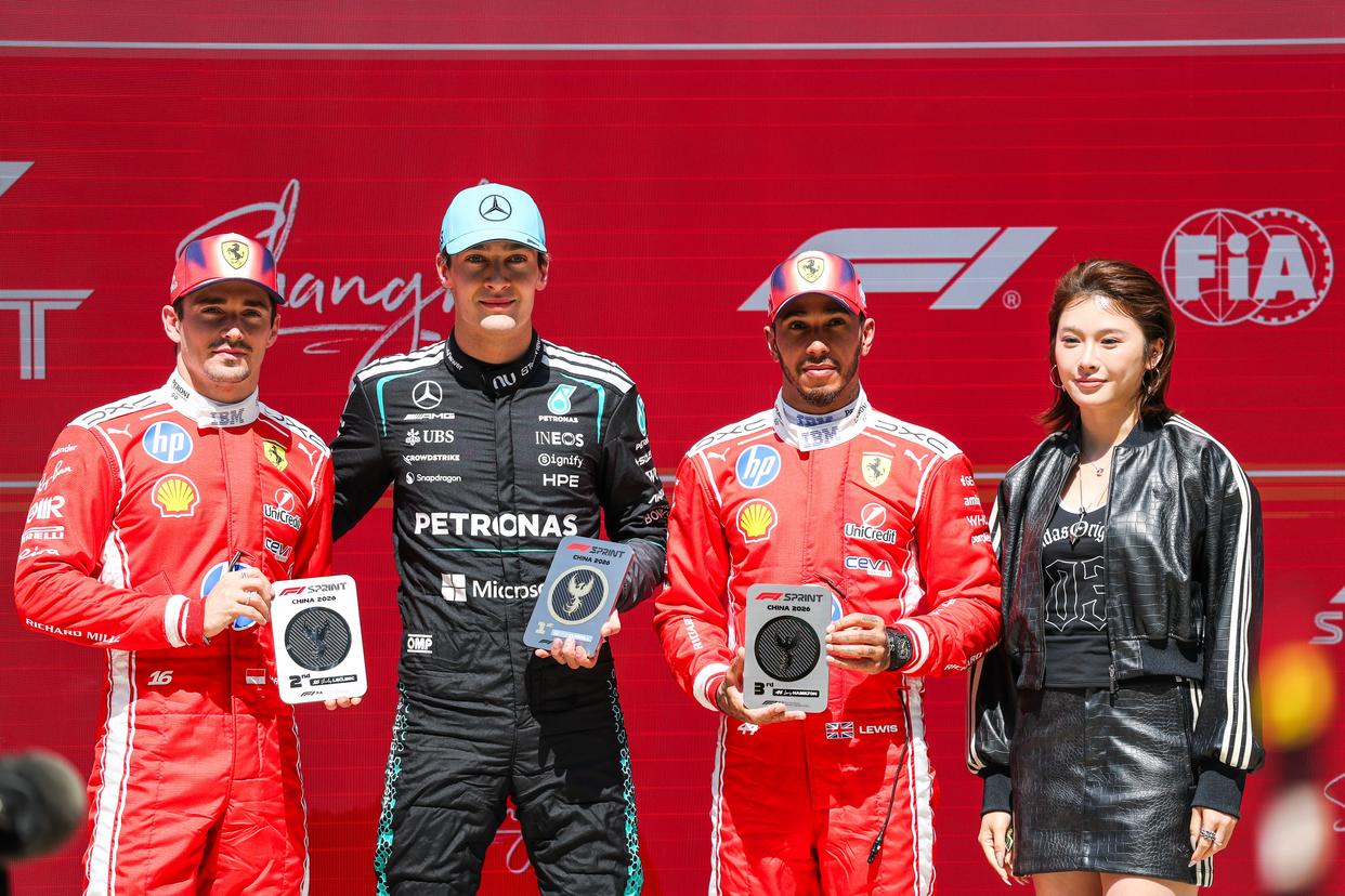 3月14日,冠军梅赛德斯车队英国车手拉塞尔(左二)、亚军法拉利车队摩纳哥车手勒克莱尔(左一)、季军法拉利车队英国车手汉密尔顿(右二)及颁奖嘉宾、中国田径运动员吴艳妮在颁奖仪式上合影。新华社发(钱俊 摄)