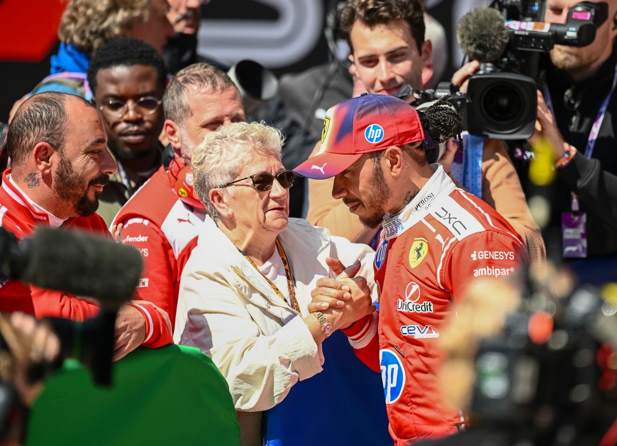 3月14日,法拉利车队英国车手汉密尔顿(右)在比赛后与母亲庆祝。他最终获得季军。新华社记者 陈浩明 摄