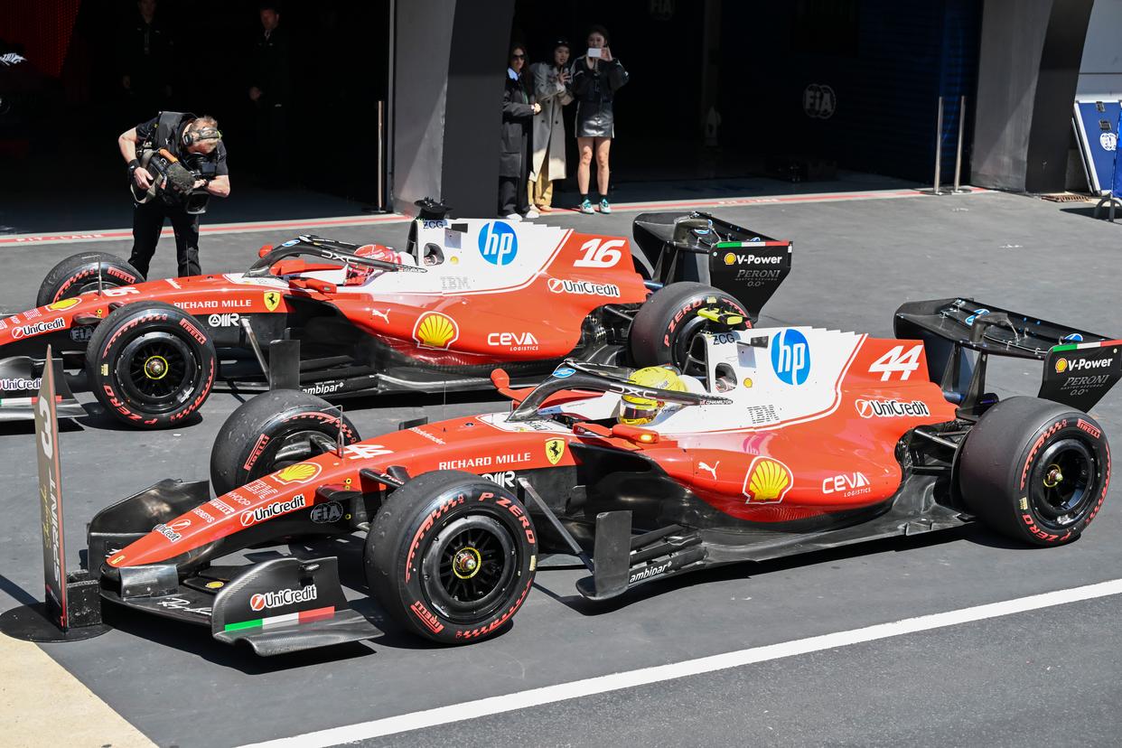 3月14日,亚军法拉利车队摩纳哥车手勒克莱尔(后)与季军法拉利车队英国车手汉密尔顿在比赛后。新华社记者 陈浩明 摄