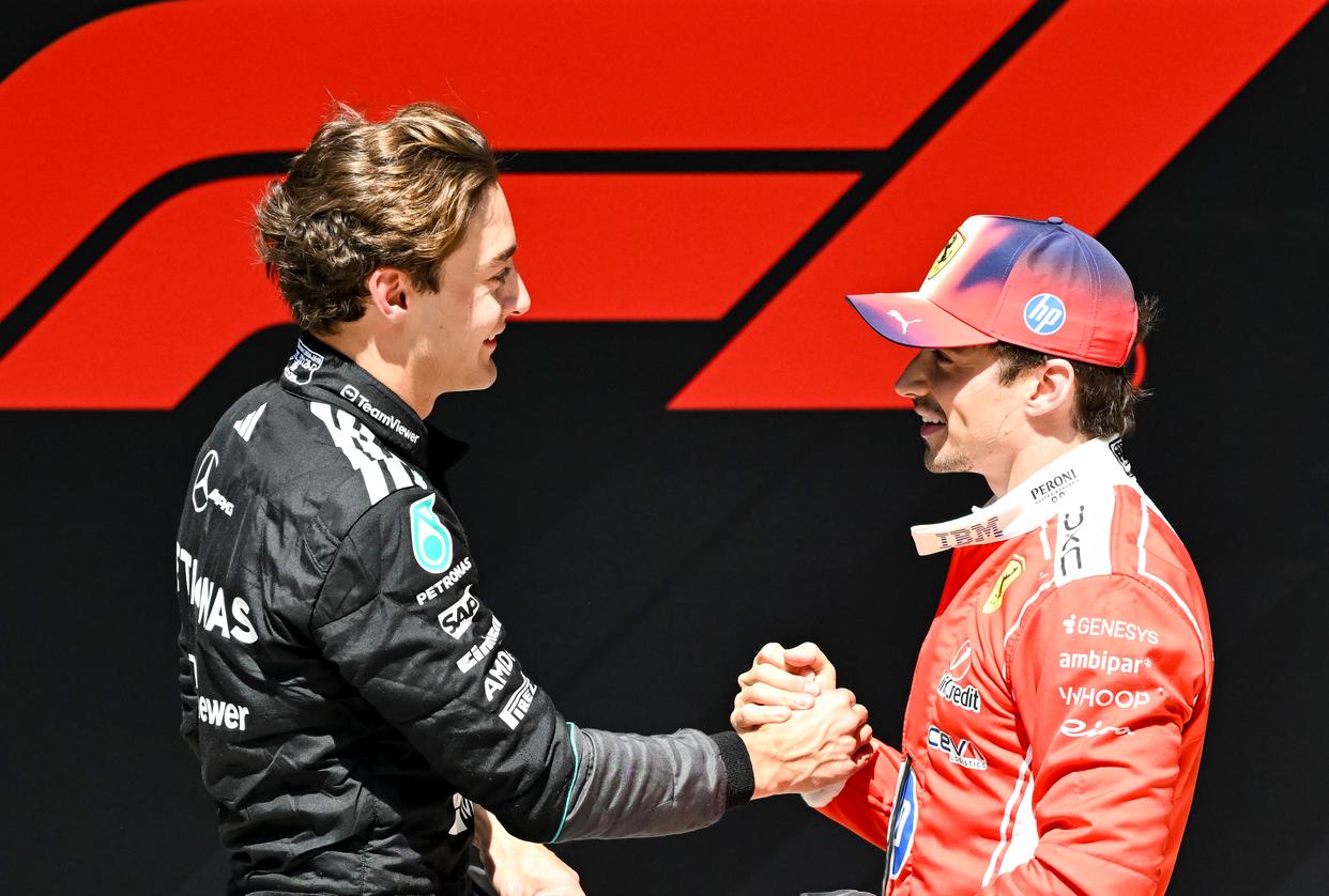 3月14日,冠军梅赛德斯车队英国车手拉塞尔(左)与亚军法拉利车队摩纳哥车手勒克莱尔在比赛后握手。新华社记者 陈浩明 摄