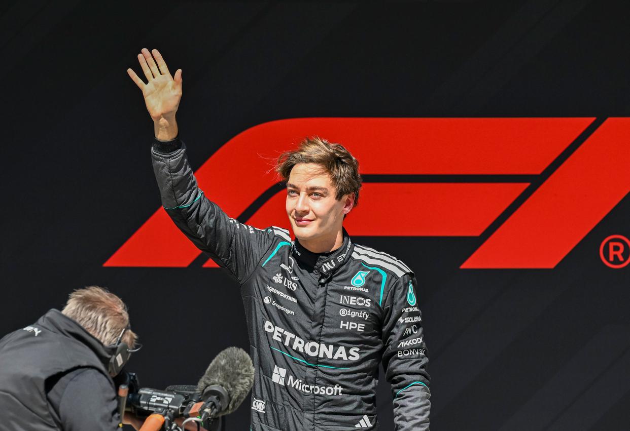 3月14日,冠军梅赛德斯车队英国车手拉塞尔在比赛后向观众挥手致意。新华社记者 陈浩明 摄