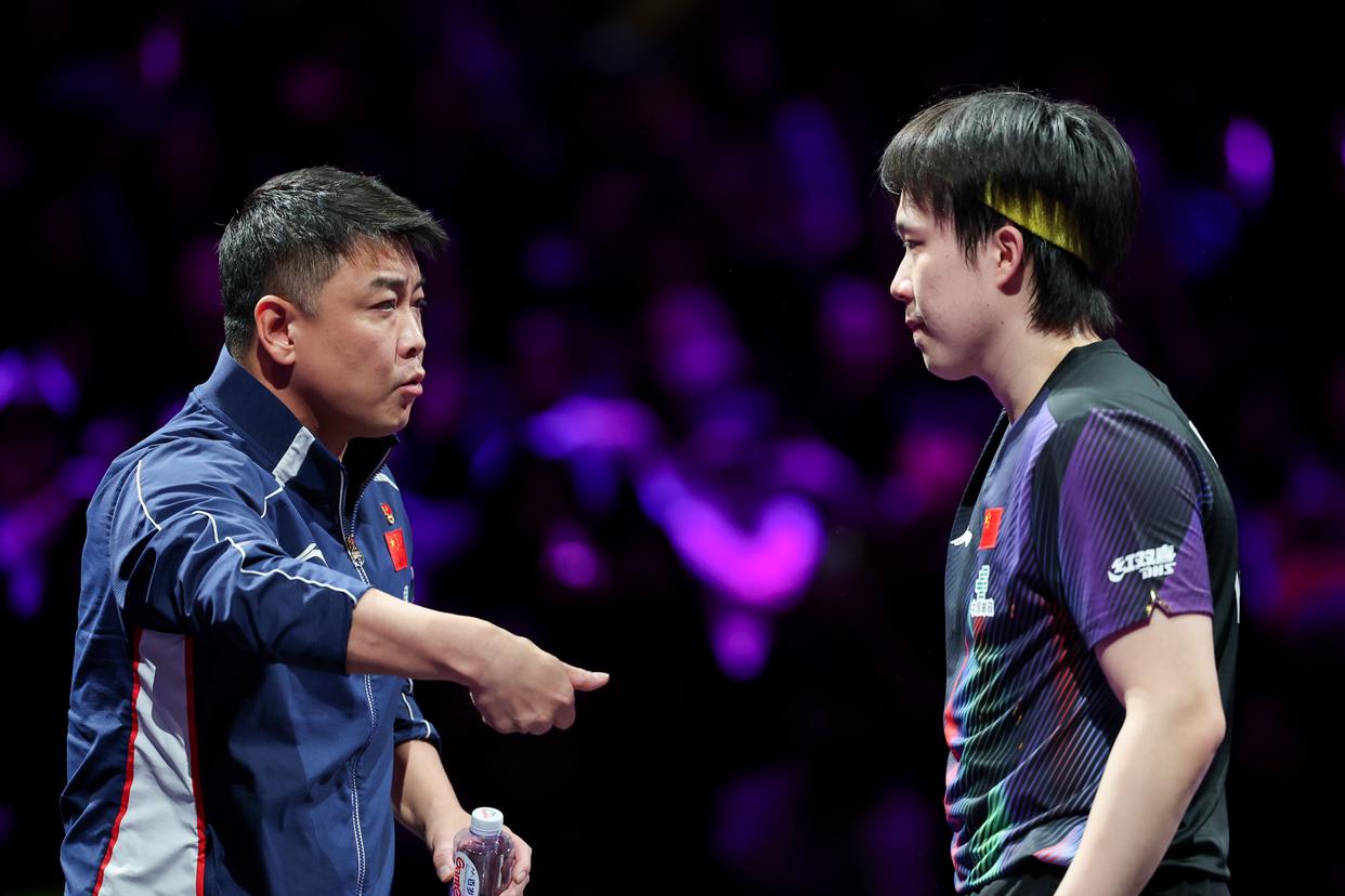 3月14日,教练王皓(左)在比赛间隙指导王楚钦。新华社记者 黄伟 摄