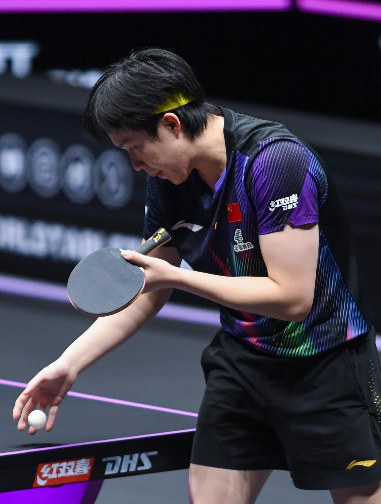 3月14日,王楚钦在比赛中发球。新华社记者 唐奕 摄