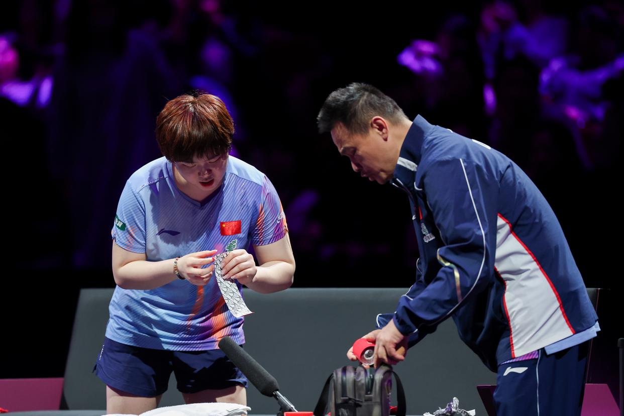 3月14日,蒯曼(左)在比赛间隙和医生沟通。新华社记者 黄伟 摄