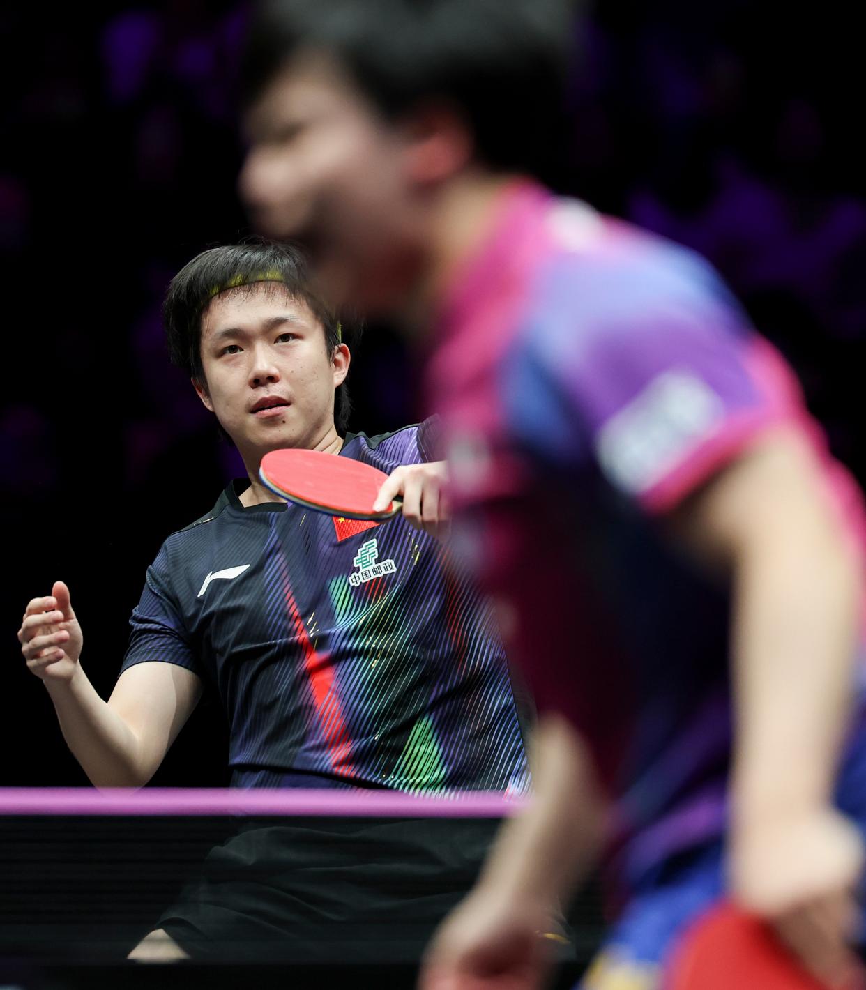 3月14日,王楚钦(左)在比赛中回球。新华社记者 黄伟 摄