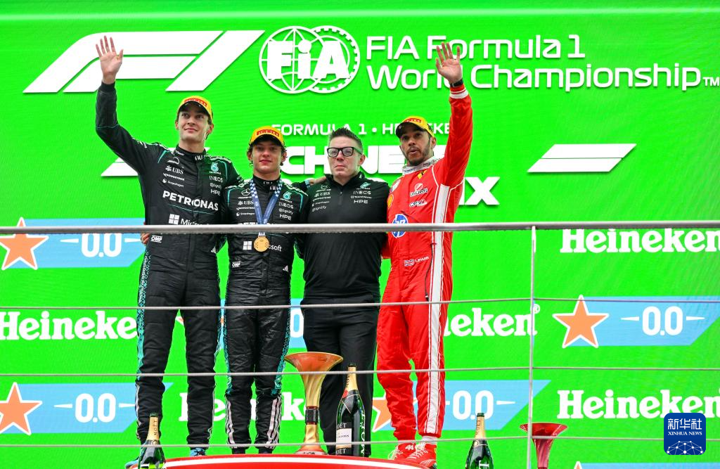 3月15日,冠军梅赛德斯车队意大利车手安东内利(左二)、亚军梅赛德斯车队英国车手拉塞尔(左一)与季军法拉利车队英国车手汉密尔顿(右一)与工程师伯宁顿在颁奖仪式上。