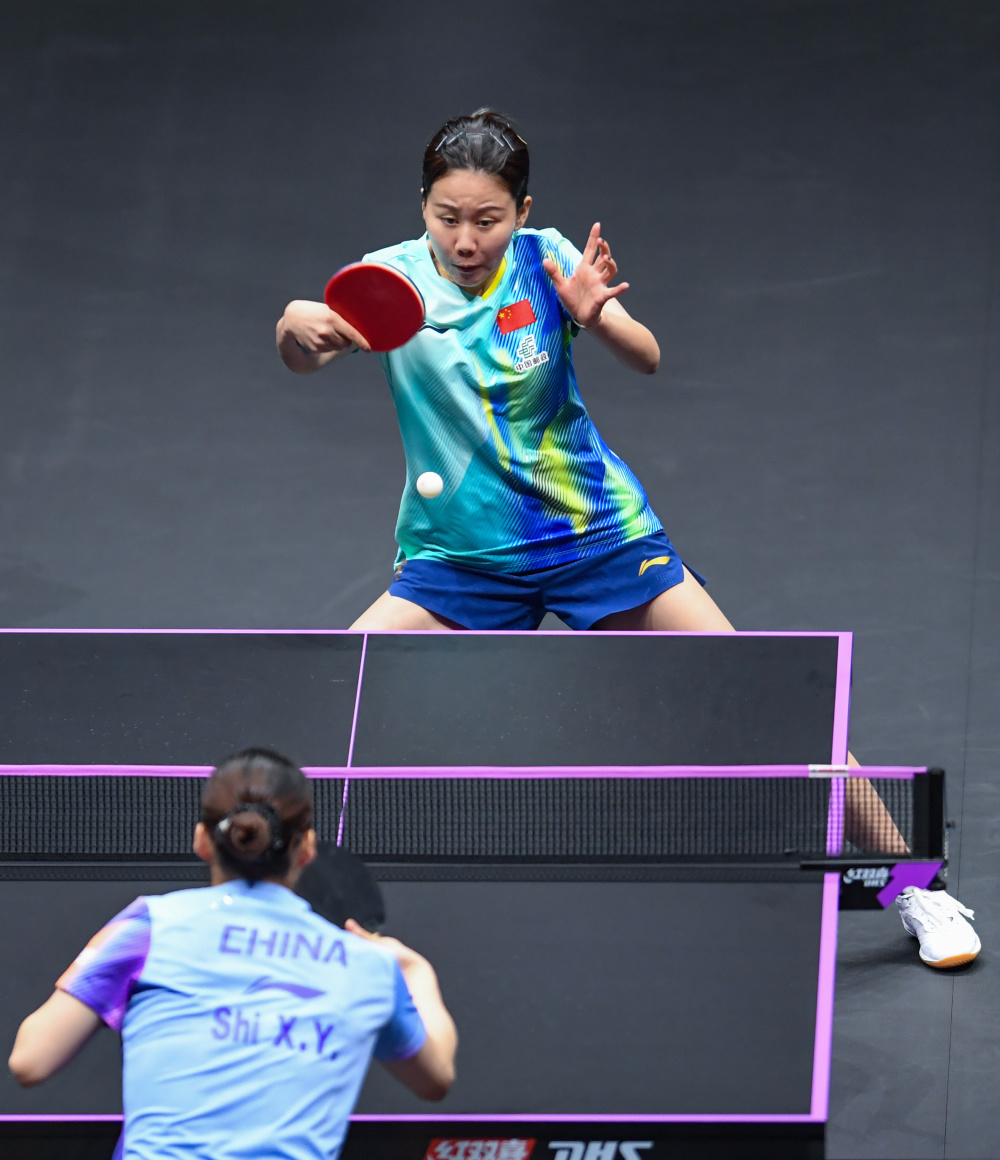 3月13日,陈幸同(上)在世界乒乓球职业大联盟(WTT)重庆冠军赛女子单打八分之一决赛中。新华社记者 唐奕 摄