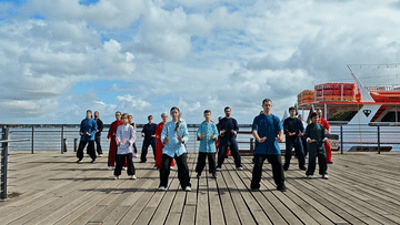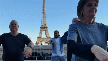 国际太极拳日前夕,太极爱好者在法国巴黎埃菲尔铁塔下习练太极拳。国际太极拳日前夕