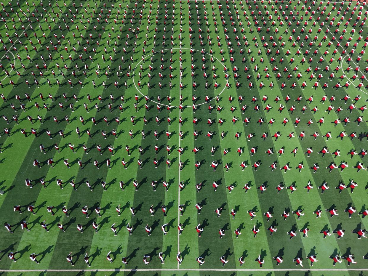 3月20日,河南省焦作市温县一中学生在课间操时间集体习练太极拳(无人机照片)。新华社发 徐宏星 摄在世界上
