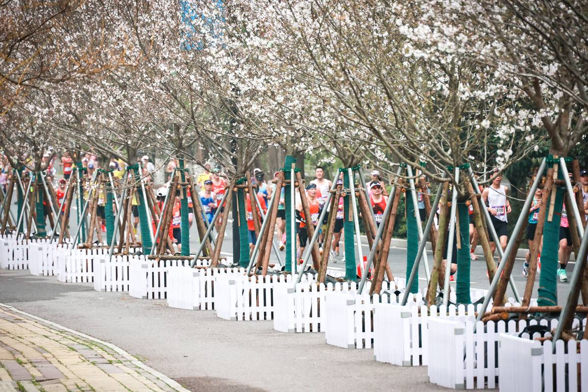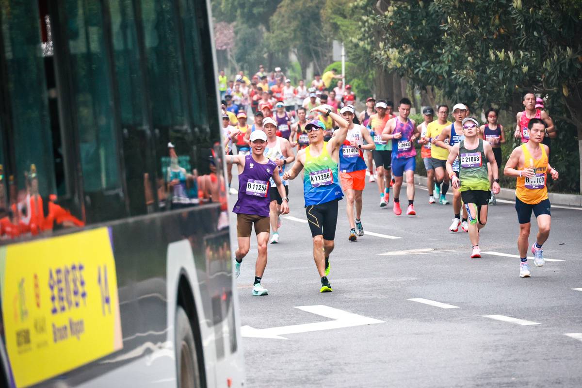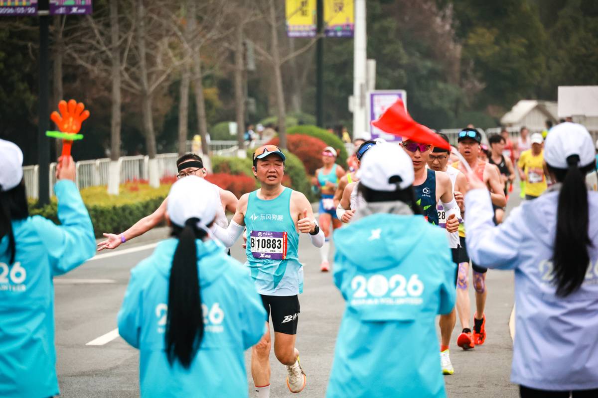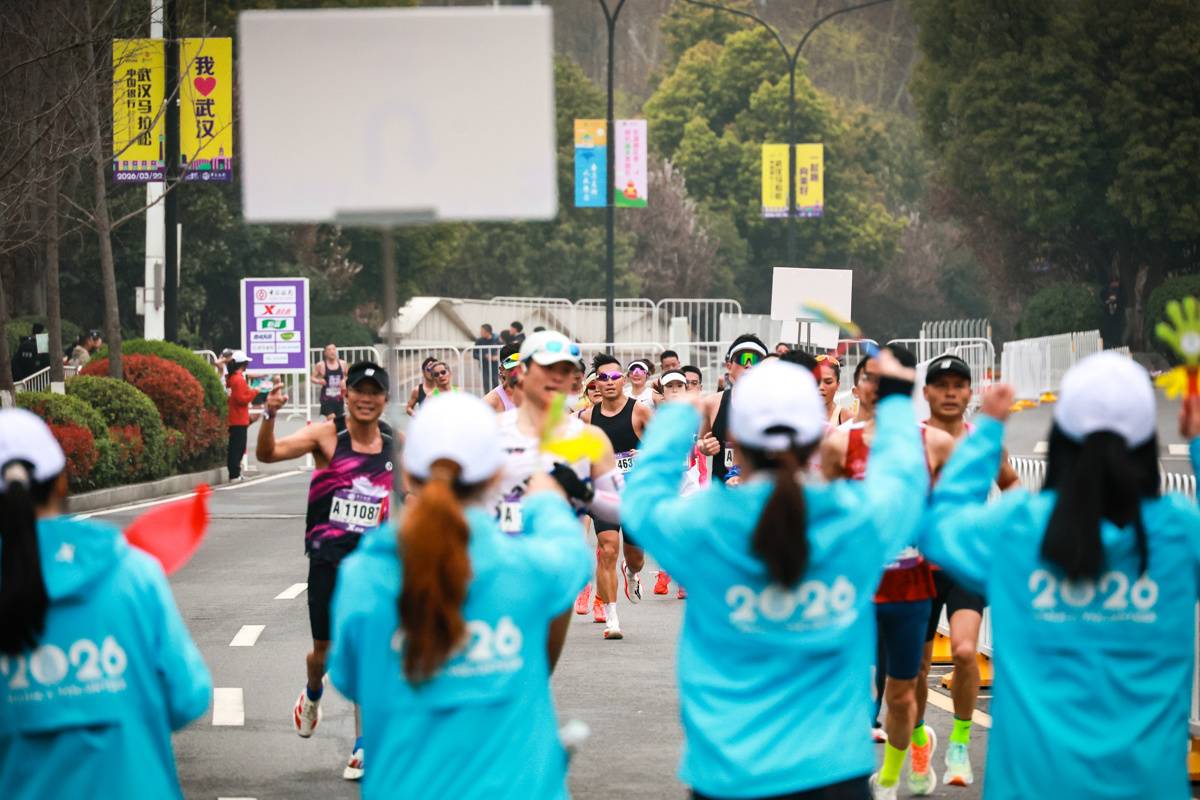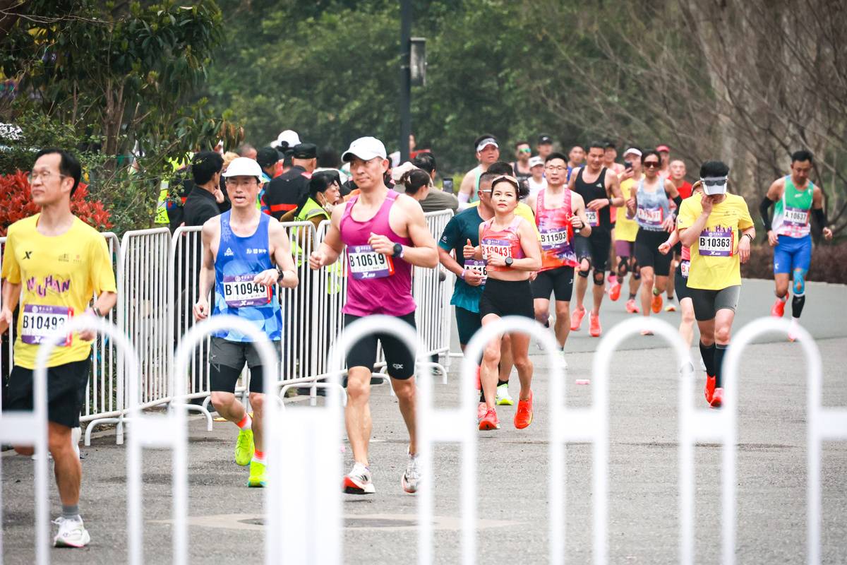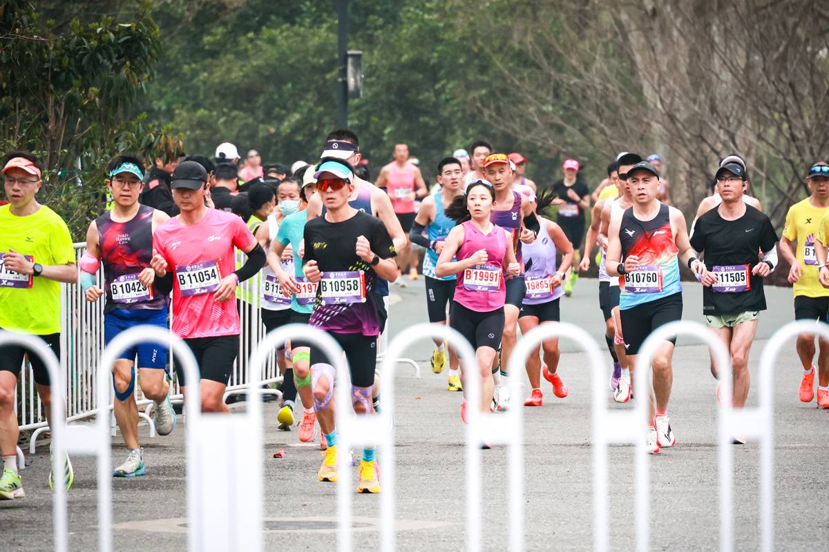 3月22日,2026武汉马拉松开跑,何杰等全马跑者首次体验东湖白马道,并跑过曾经的全马终点欢乐谷。(湖北日报全媒记者 时龚 摄)