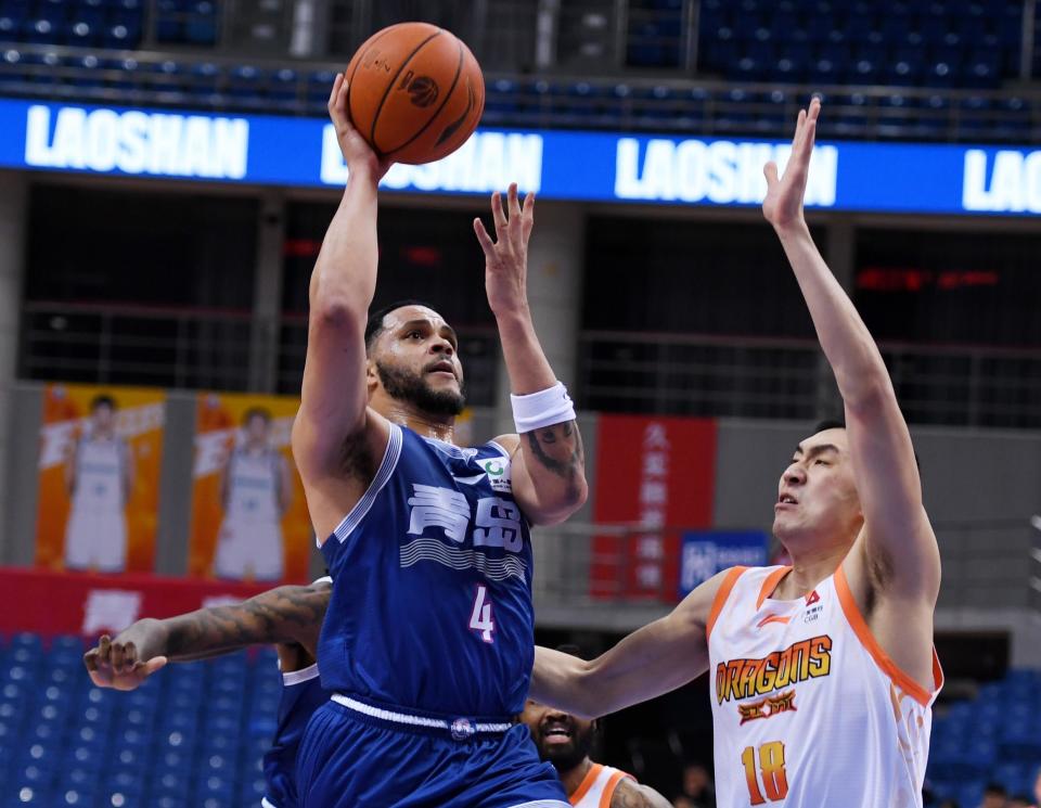 3月18日,青岛队球员韦瑟斯庞(左)在比赛中上篮。新华社记者 李紫恒 摄
