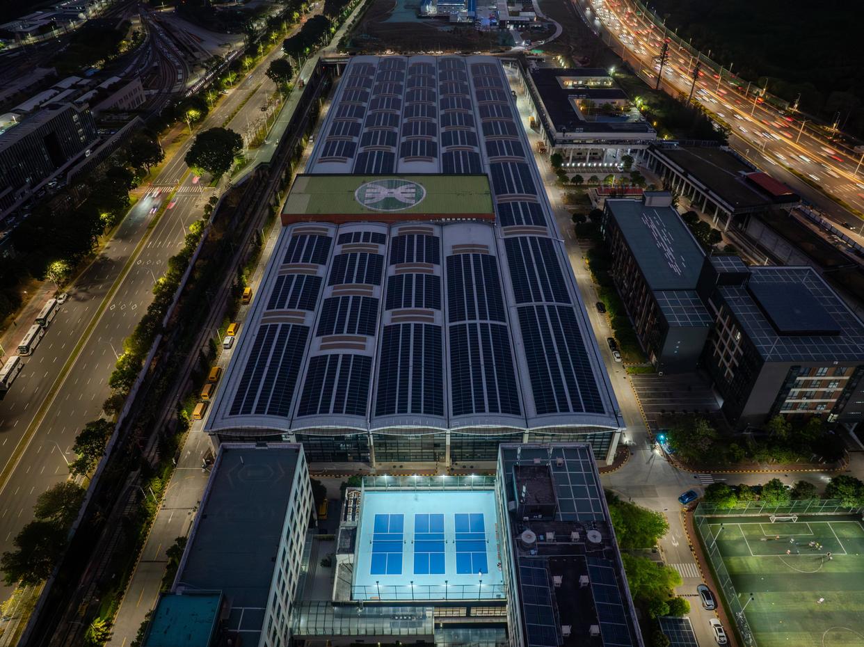 3月21日,在深圳地铁侨城东车辆段,市民在屋顶增设的匹克球场打球(无人机照片)。新华社记者 毛思倩 摄