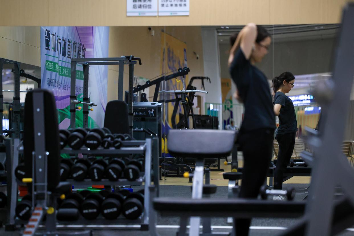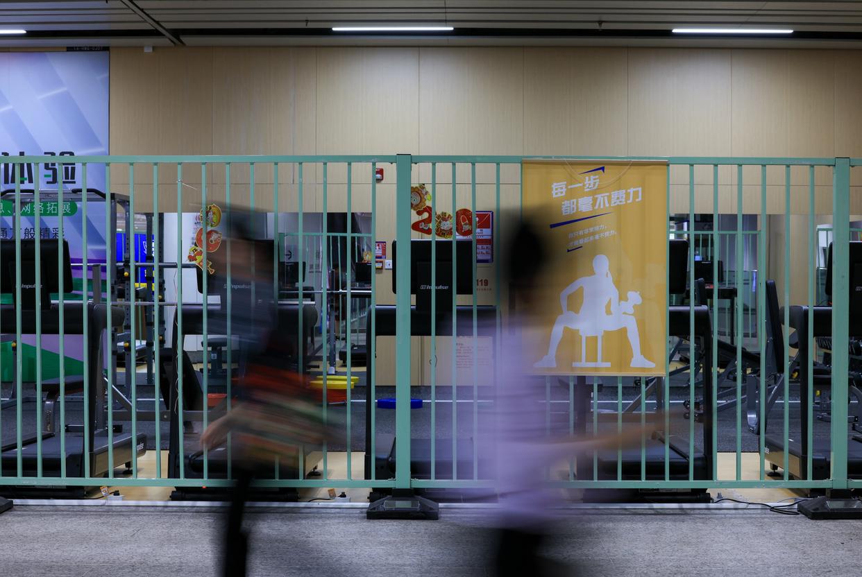 3月18日,在深圳地铁黄木岗站,搭乘地铁的乘客经过站内开设的健身房。新华社记者 毛思倩 摄
