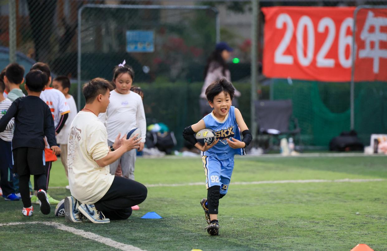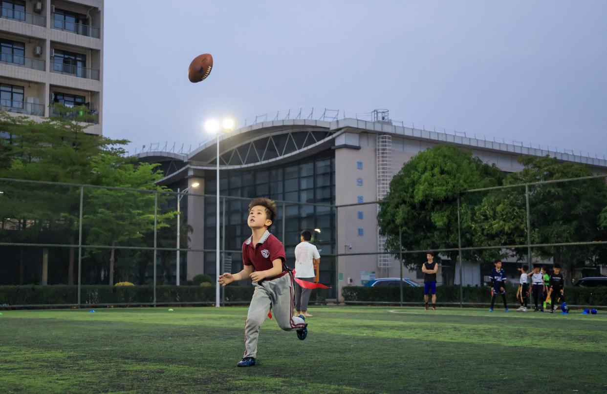 3月21日,在深圳市福田区的深圳地铁侨城东车辆段,儿童在地铁停车场上方建设的运动场练习橄榄球。新华社记者 毛思倩 摄