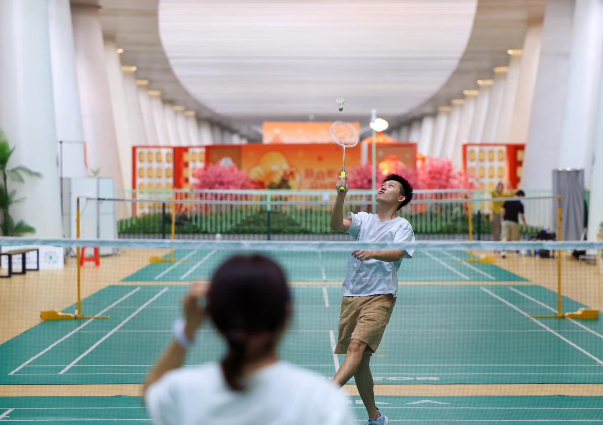 3月18日,在深圳地铁黄木岗站内的羽毛球场,市民在打羽毛球。新华社记者 毛思倩 摄