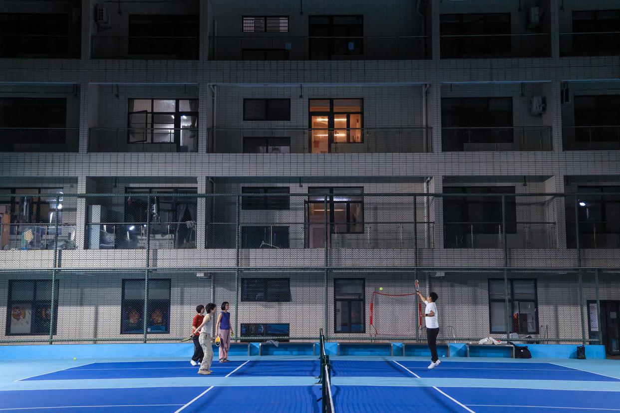 3月21日,在深圳市福田区的深圳地铁侨城东车辆段,市民在屋顶增设的匹克球场打球。新华社记者 毛思倩 摄