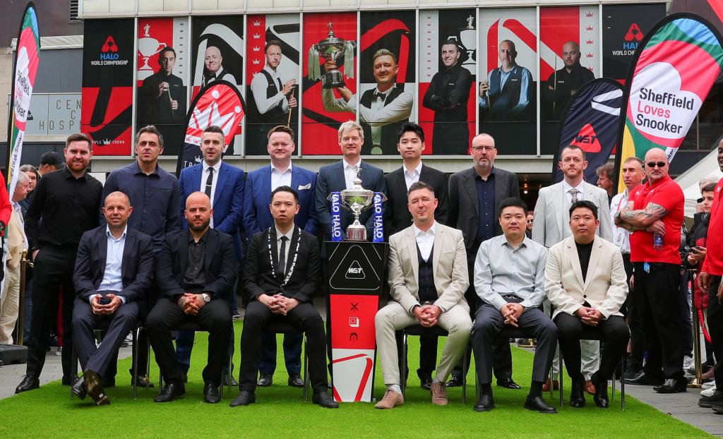 2025年4月18日,世界斯诺克锦标赛参赛选手与奖杯合影。新华社发(翟政摄)