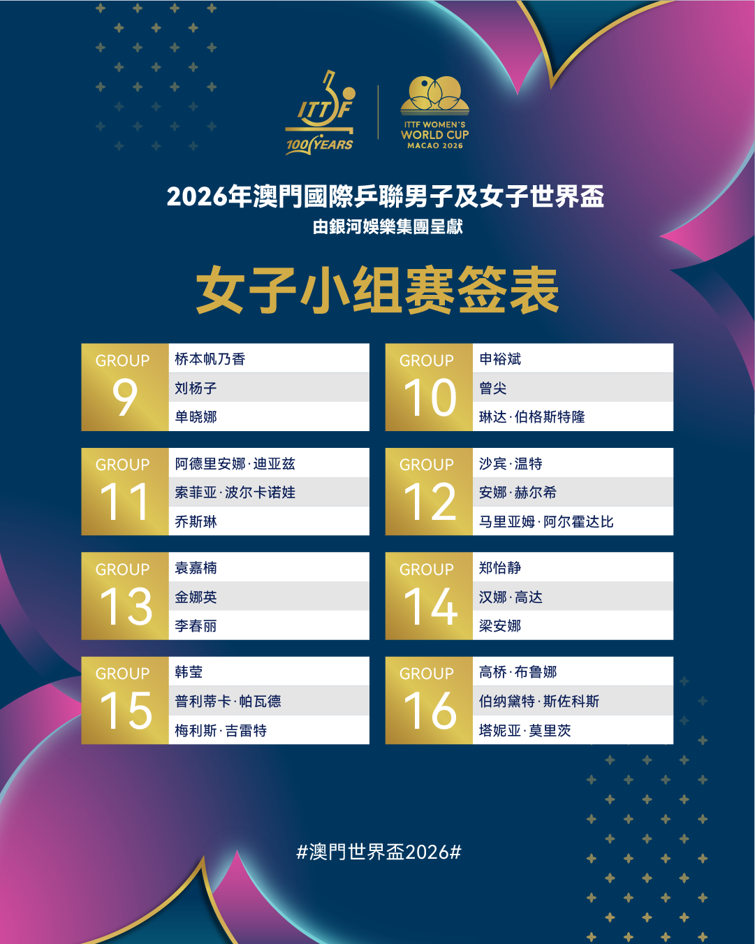 2026年澳门国际乒联男子及女子世界杯将于3月30日至4月5日在中国澳门银河综艺馆举行。届时,来自五大洲的男、女各48位顶尖运动员们将展开激烈角逐,本次赛事小组赛签表已出炉。