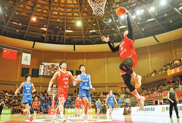 3月28日晚,衡阳队球员(红)与永州队球员(蓝)在比赛中。