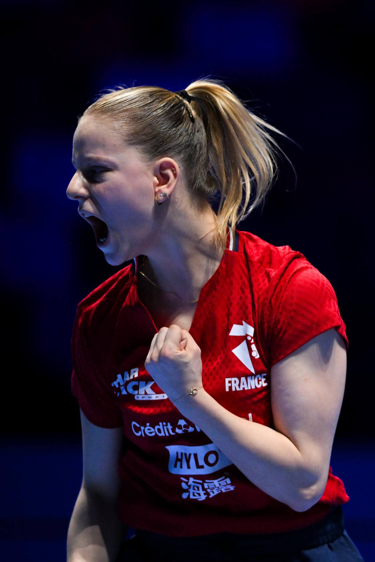 3月30日,法国选手夏洛特·卢茨在女子单打小组赛中庆祝得分。最终,她2比3不敌中国选手蒯曼。新华社发(张金加摄)