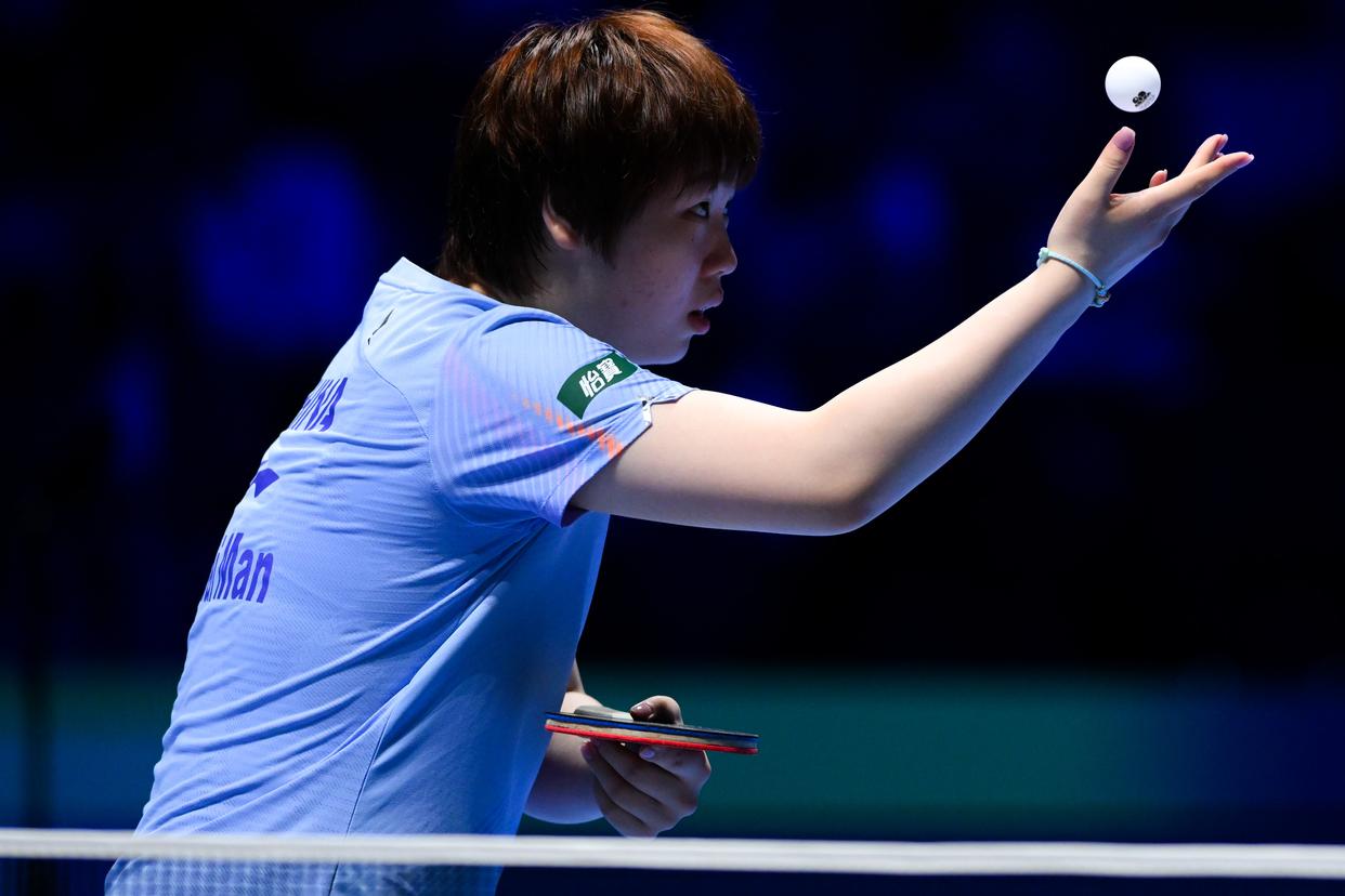 3月30日,中国选手蒯曼在女子单打小组赛中发球。最终,她3比2战胜法国选手夏洛特·卢茨。新华社发(张金加摄)