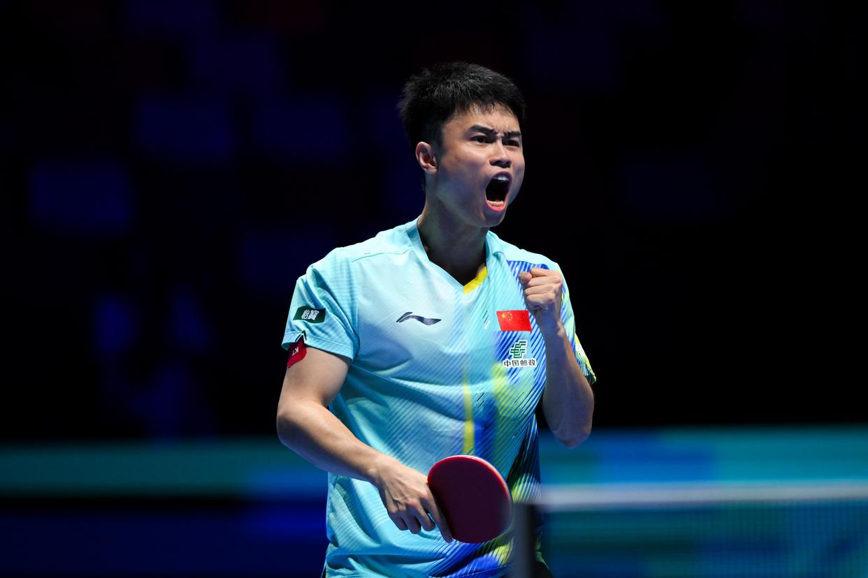 3月30日,中国选手周启豪在男子单打小组赛中庆祝得分。最终,他3比1战胜日本选手川上流星。 新华社发(张金加摄)