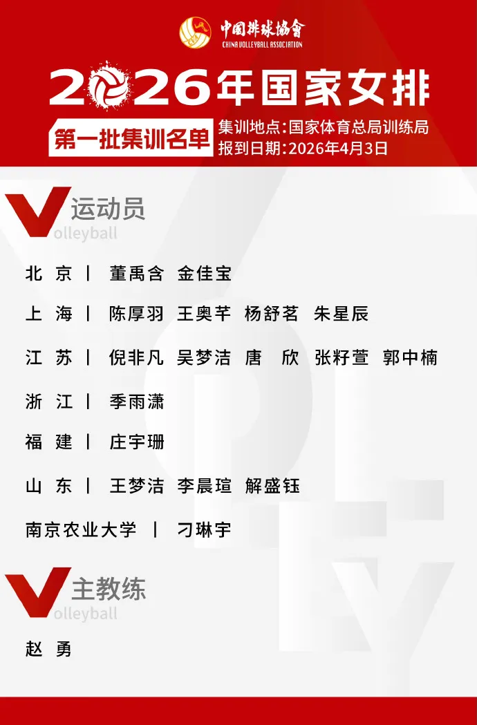 据新华社:中国女排2026年首批集训名单2日正式出炉,球队的目标是夺取亚锦赛冠军,从而取得2028年洛杉矶奥运会的入场券。