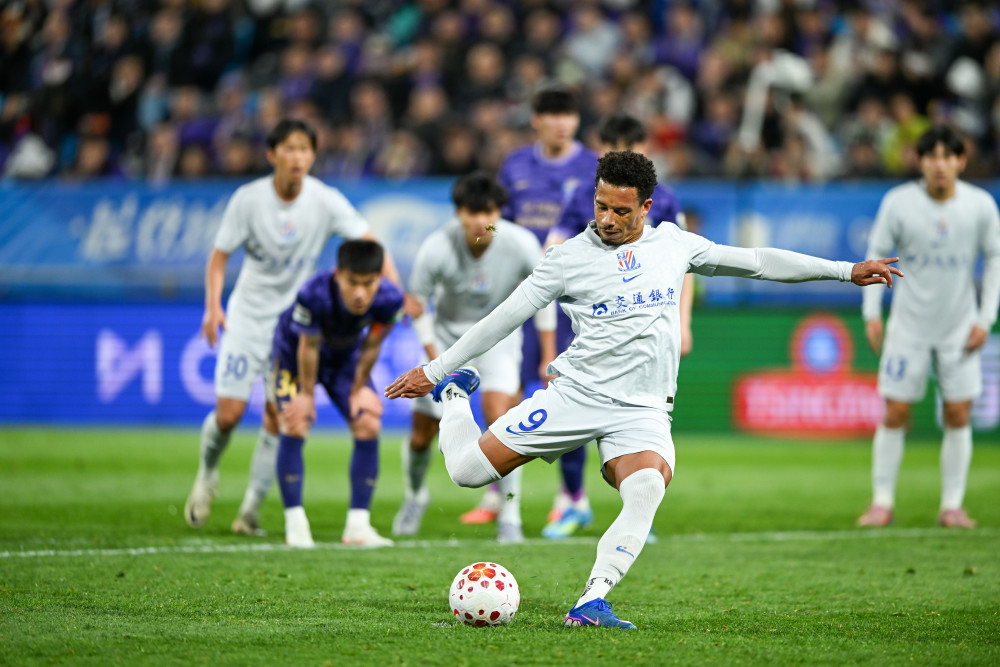 4月5日,上海申花队球员拉唐在比赛中点球进球。新华社记者 孙凡越 摄